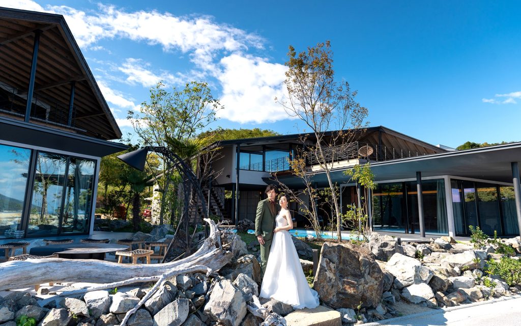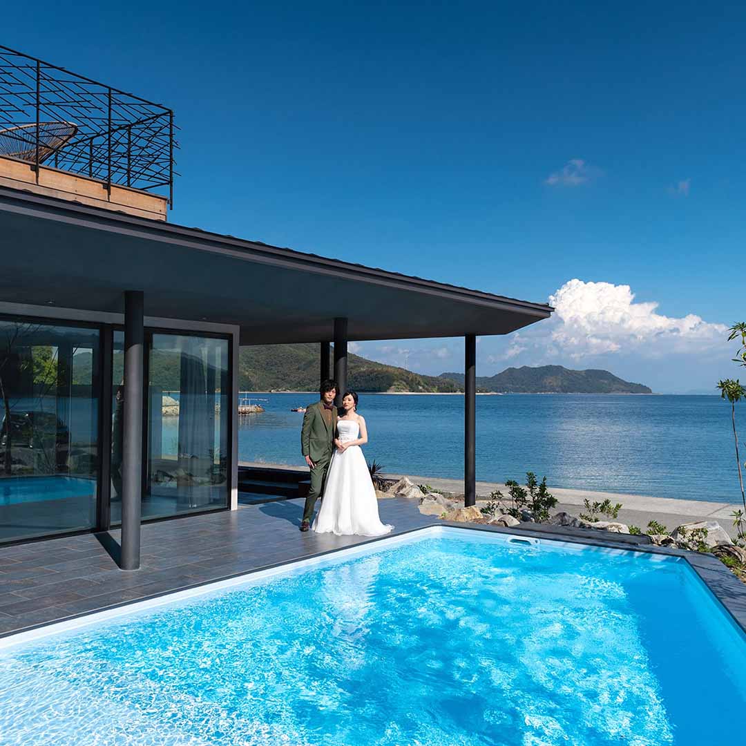 美しい瀬戸内の海を眺める一軒家を貸し切り、ゆったりと滞在しながら撮影や挙式、ご会食ができます。ご両家のご家族一緒に、笑顔に包まれながら、これからはじまるおふたりの門出を祝福できる人気のウエディングスタイルです。
