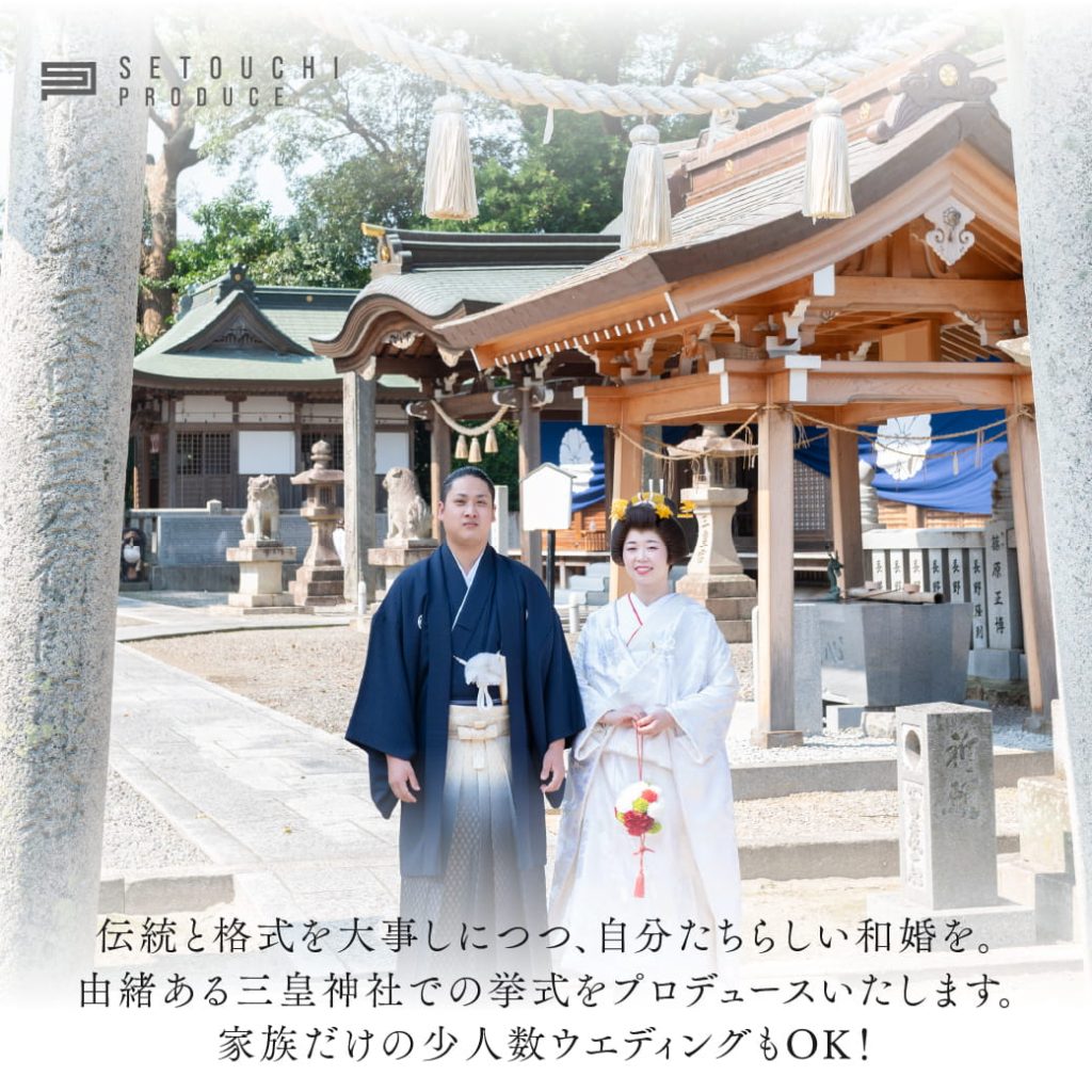 瀬戸内プロデュースでは、伝統と格式を大事にしつつ、自分たちらしい和婚をしたい、というカップル様のために、三皇神社での挙式をプロデュースいたします。