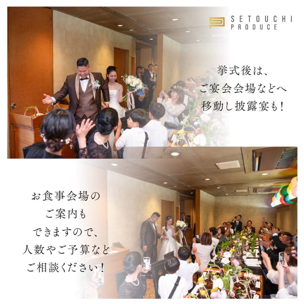 家族だけの少人数ウエディングや、挙式後の披露宴会場の手配などもお任せください。